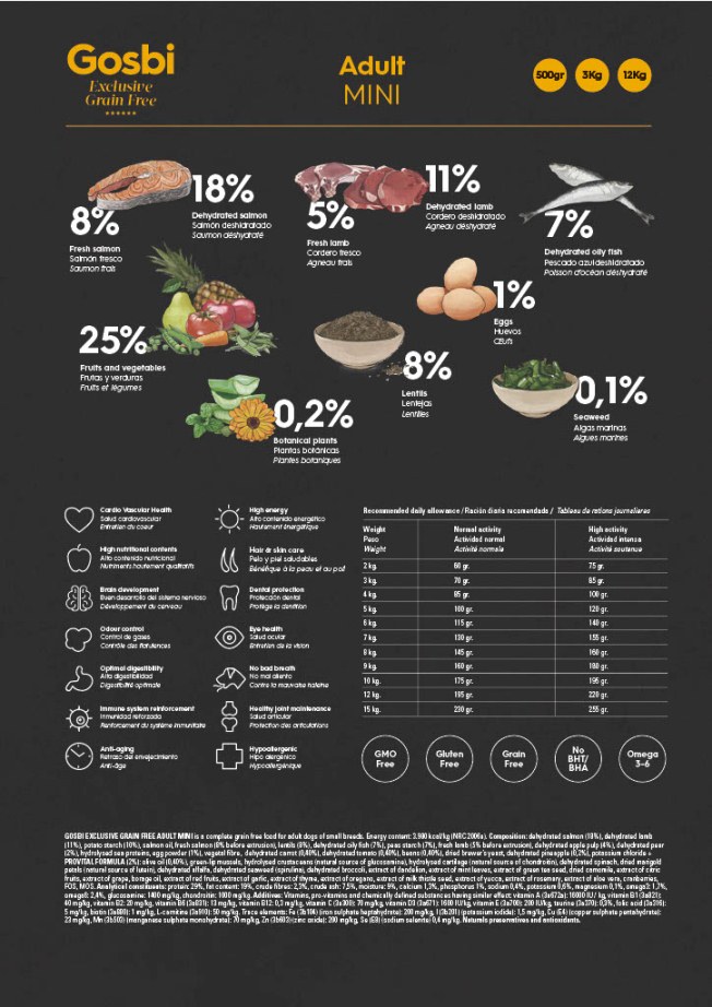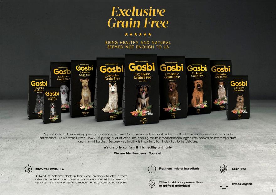 Gosbi е шпански бренд за храна за миленици кој нуди природна и висококвалитетна исхрана за кучиња и мачки. Направена со внимателно одбрани состојки, без вештачки бои, ароми или конзерванси, храната од Gosbi се базира на медитеранска диета богата со месо, риба, овошје и зеленчук.